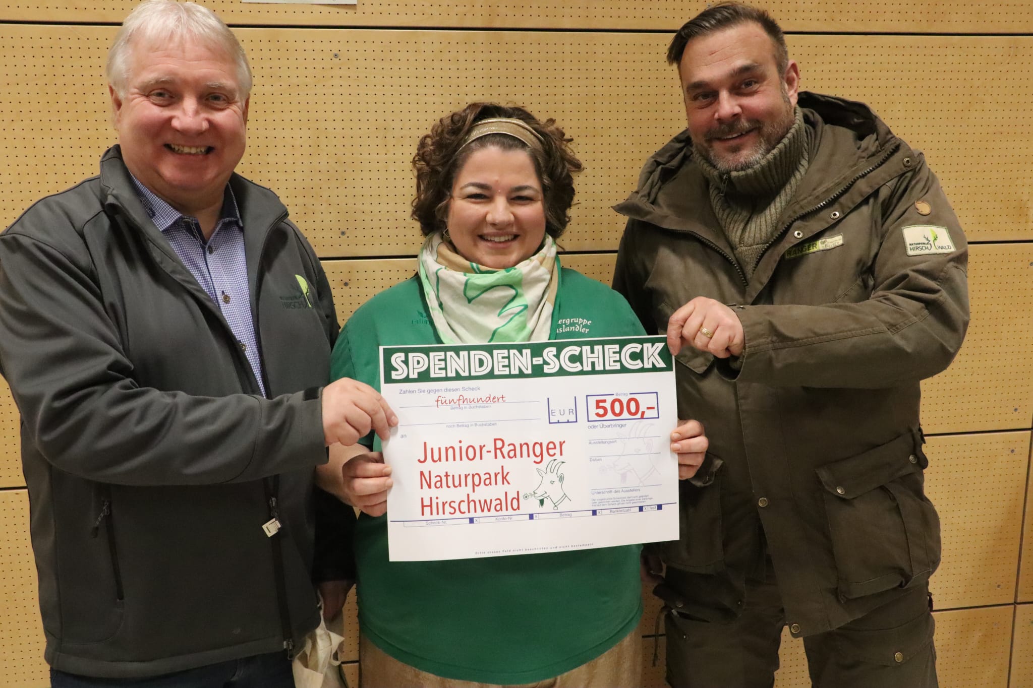 An Ranger Christian Rudolf und Vorsitzenden Markus Dollacker übergab Spartenleiterin Franziska Haas-Würz, als Vertreterin der Theaterfreunde, die Spende. „Wir freuen uns sehr, mit unserer Spende das Engagement zur Umweltbildung und die wichtige Arbeit für den Naturschutz im Hirschwald unterstützen zu können“, betonte sie bei der Übergabe.